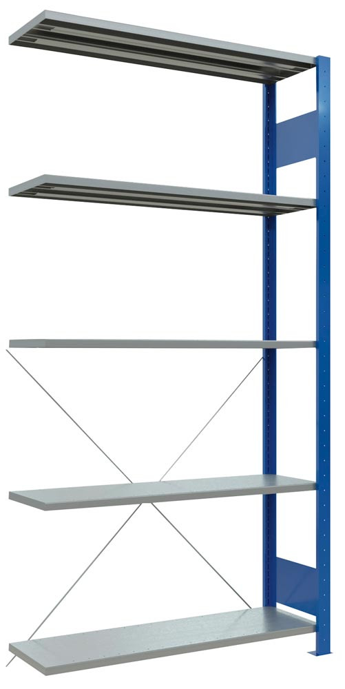 Steckregal, RAL 5010 enzianblau, Anbaufeld, 5 verzinkte Fachböden, BxTxH 750x300x2000 mm, Fachlast 150 kg E1992011