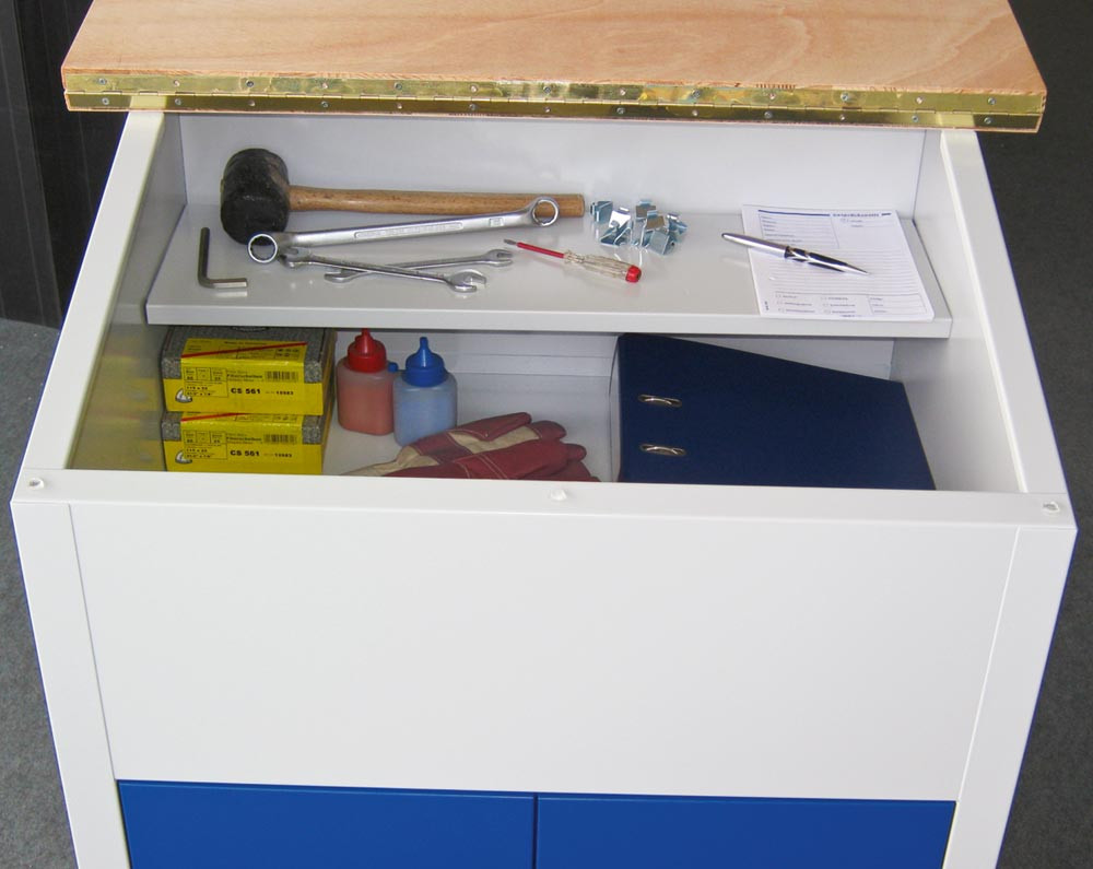 · Höhe vorne: 1100 mm, Höhe hinten: 1200 mm · Mit 2 festen Fachböden, sowie fest verschweißtem Pult, in dem sich ein ca. 200 mm tiefer Boden befindet ∙ Die Türen mit Verstärkungstaschen sind gemeinsam durch Zylinderschloss verschließbar ∙ Alle Stahlteile sind pulverbeschichtet · Aufklappbarer Deckel aus Tischlerplatte, geölt, mit Abrollkante vorne und hinten