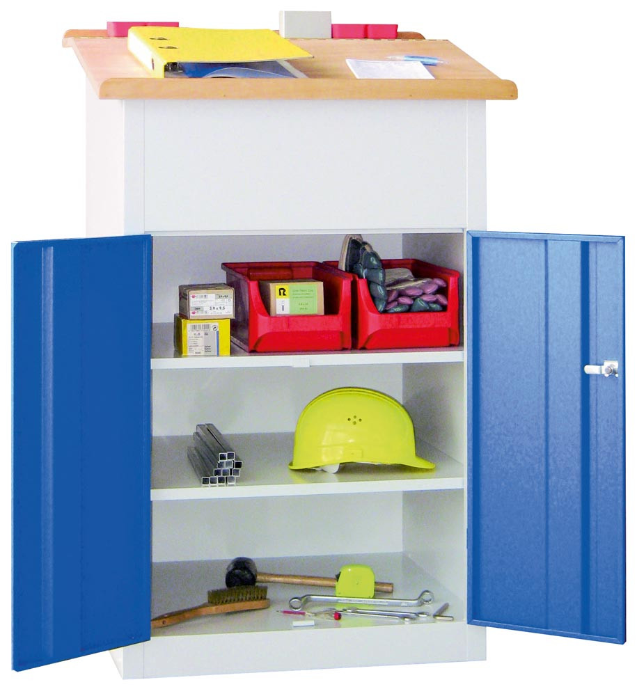 · Höhe vorne: 1100 mm, Höhe hinten: 1200 mm · Mit 2 festen Fachböden, sowie fest verschweißtem Pult, in dem sich ein ca. 200 mm tiefer Boden befindet ∙ Die Türen mit Verstärkungstaschen sind gemeinsam durch Zylinderschloss verschließbar ∙ Alle Stahlteile sind pulverbeschichtet · Aufklappbarer Deckel aus Tischlerplatte, geölt, mit Abrollkante vorne und hinten