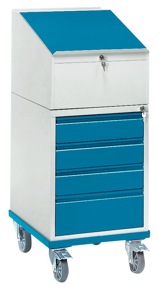 ∙ Stehpult aus Stahlblech, abschließbar, pulverbeschichtet RAL 7035 lichtgrau ∙ Schreibplatte aufklappbar, mit aufgeklebter Schreibunterlage ∙ Stahlschrank-Unterbau mit 3 Schubladen 120 mm, 1 Schublade 180 mm hoch auf Kugelauszug mit Auszugsperre und Zentralverschluß ∙ Tragkraft 25 kg/Schublade ∙ Unterbau Korpus RAL 7035 lichtgrau, Fronten RAL 5007 brillantblau pulverbeschichtet ∙ 4 Lenkrollen mit Vollgummi-Bereifung, 2 davon mit Feststeller ∙ Naben mit Rollenlager