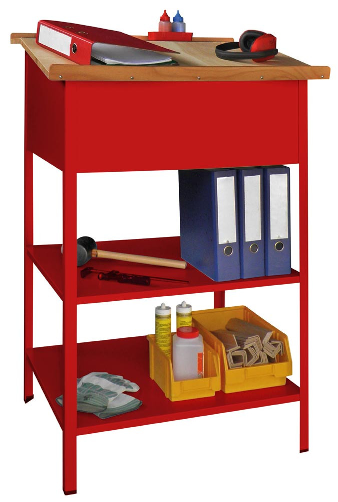 ∙ Höhe vorne: 1100 mm, Höhe hinten: 1200 mm ∙ Gestell aus Winkelstahlprofil mit 2 festen Fachböden, sowie fest verschweißtem Pult, in dem sich ein ca. 200 mm tiefer Boden befindet ∙ Alle Stahlteile sind pulverbeschichtet ∙ Aufklappbarer Deckel aus Tischlerplatte, geölt, mit Abrollkante vorne und hinten