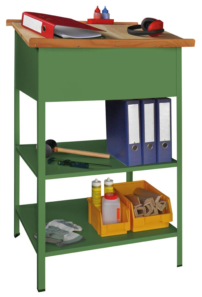 ∙ Höhe vorne: 1100 mm, Höhe hinten: 1200 mm ∙ Gestell aus Winkelstahlprofil mit 2 festen Fachböden, sowie fest verschweißtem Pult, in dem sich ein ca. 200 mm tiefer Boden befindet ∙ Alle Stahlteile sind pulverbeschichtet ∙ Aufklappbarer Deckel aus Tischlerplatte, geölt, mit Abrollkante vorne und hinten