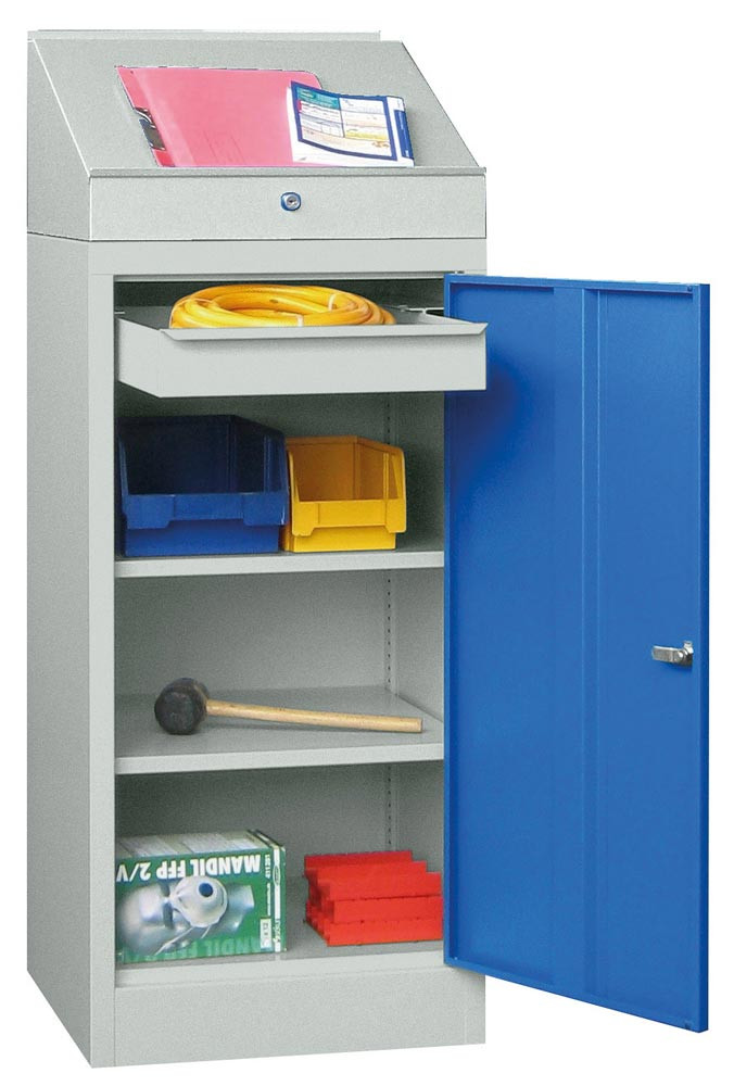 Stehpult stationär, BxTxH 500x500x1000/1270 mm, 2 Böden, 1 Schublade, RAL 7035/5010 E1568170