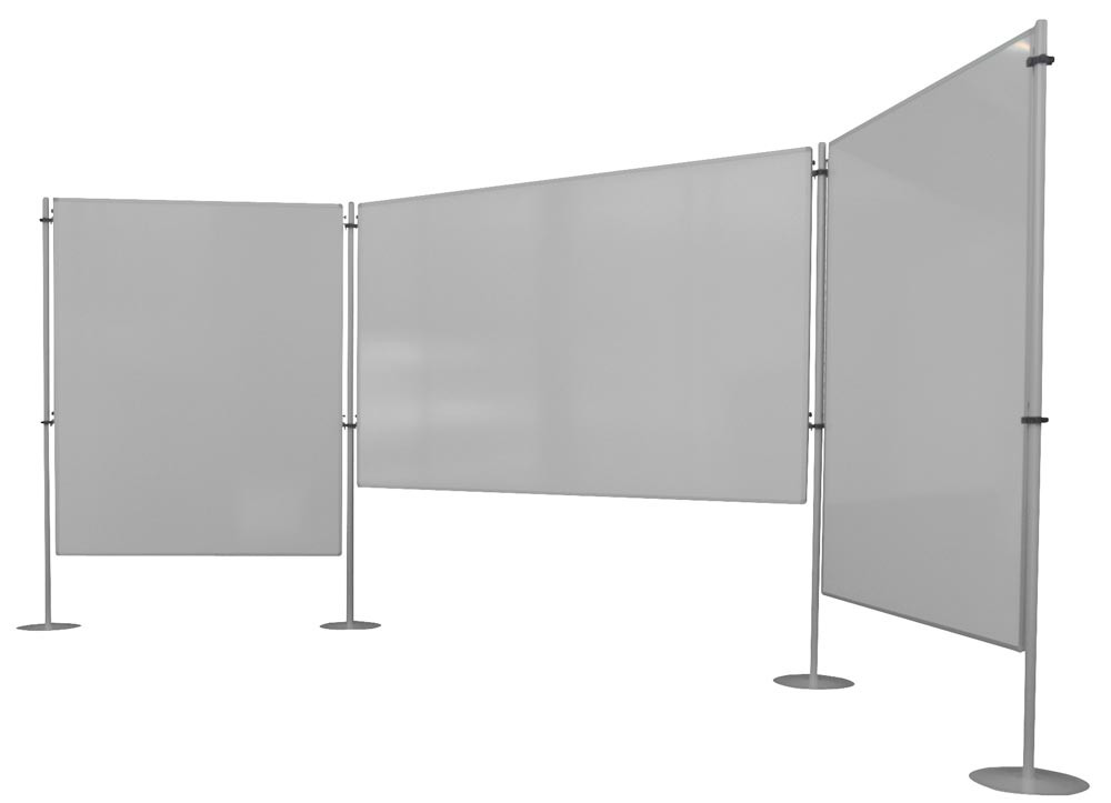 · Wandelemente mit umlaufendem Aluminiumrahmen · Vertikal oder horizontal einhängbar · Höhenverstellbar mit verschiebbaren Metallhaken · Stative in verschiedenen Ausführungen und 2 Höhen als Zubehör wählbar