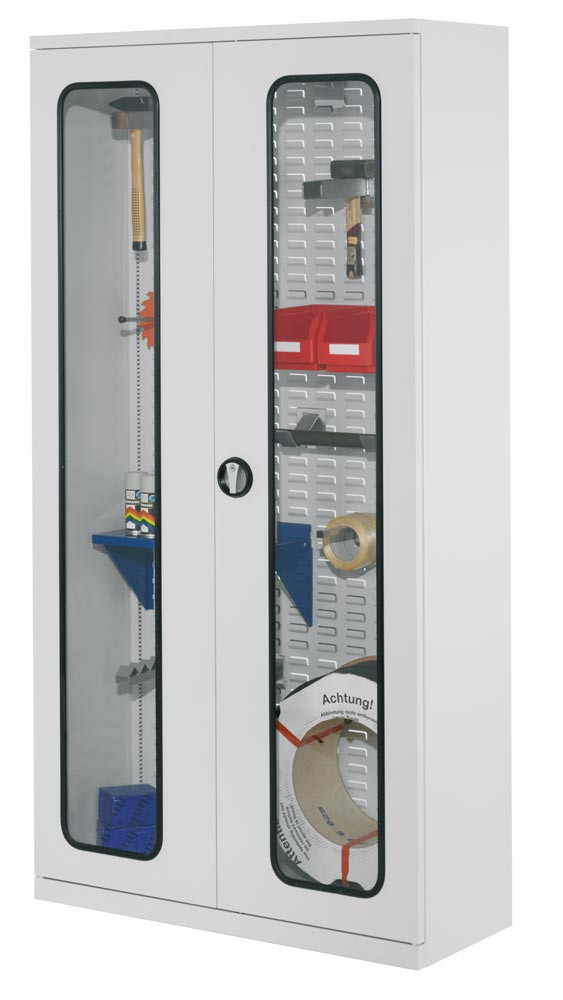 Systemschrank mit Schlitzplatten-Rückwand, Türen mit Sichtfenster, BxTxH 1000x410x1950 mm, RAL 7035 lichtgrau