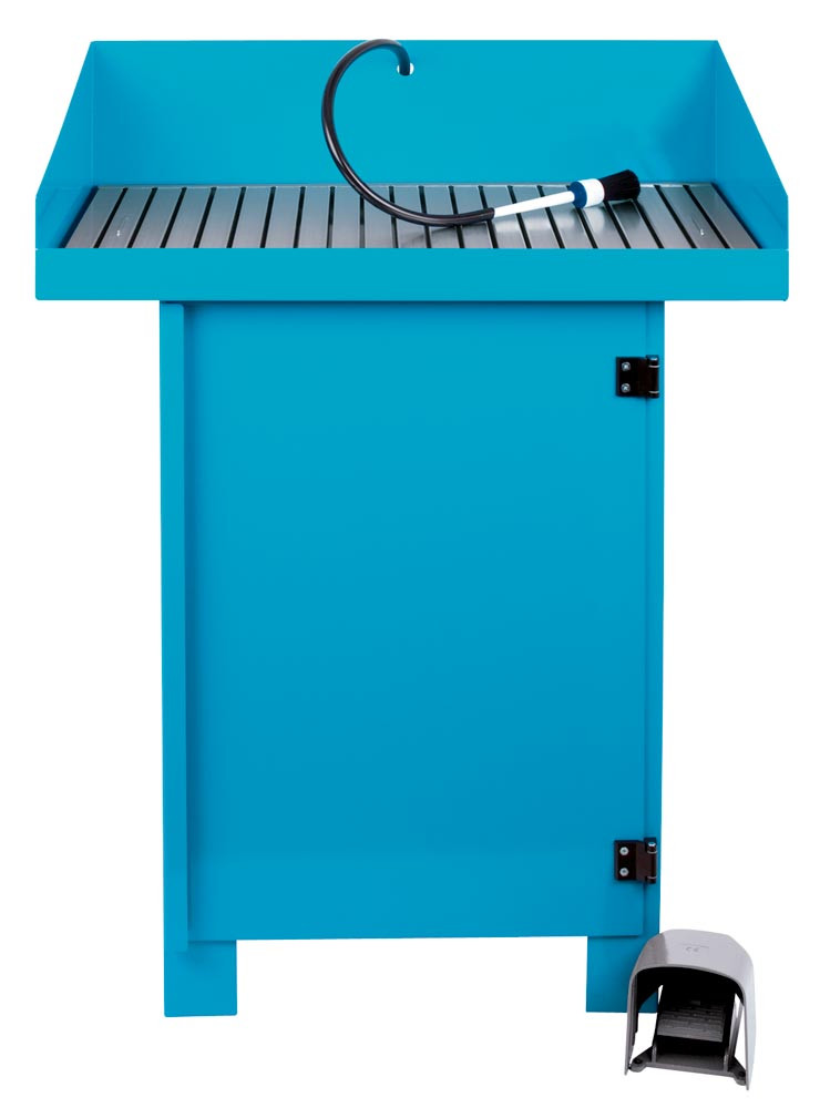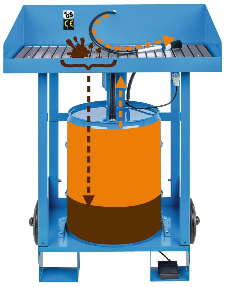 ∙ Die Spezialpumpe, 230 V, fördert die Reinigungsflüssigkeit aus dem Fass über einen Schlauch zum Reinigungspinsel (Hohlpinsel) ∙ Die verschmutzte Flüssigkeit läuft über den Auflagerost in die Wanne und in den Ablaufstutzen zurück in