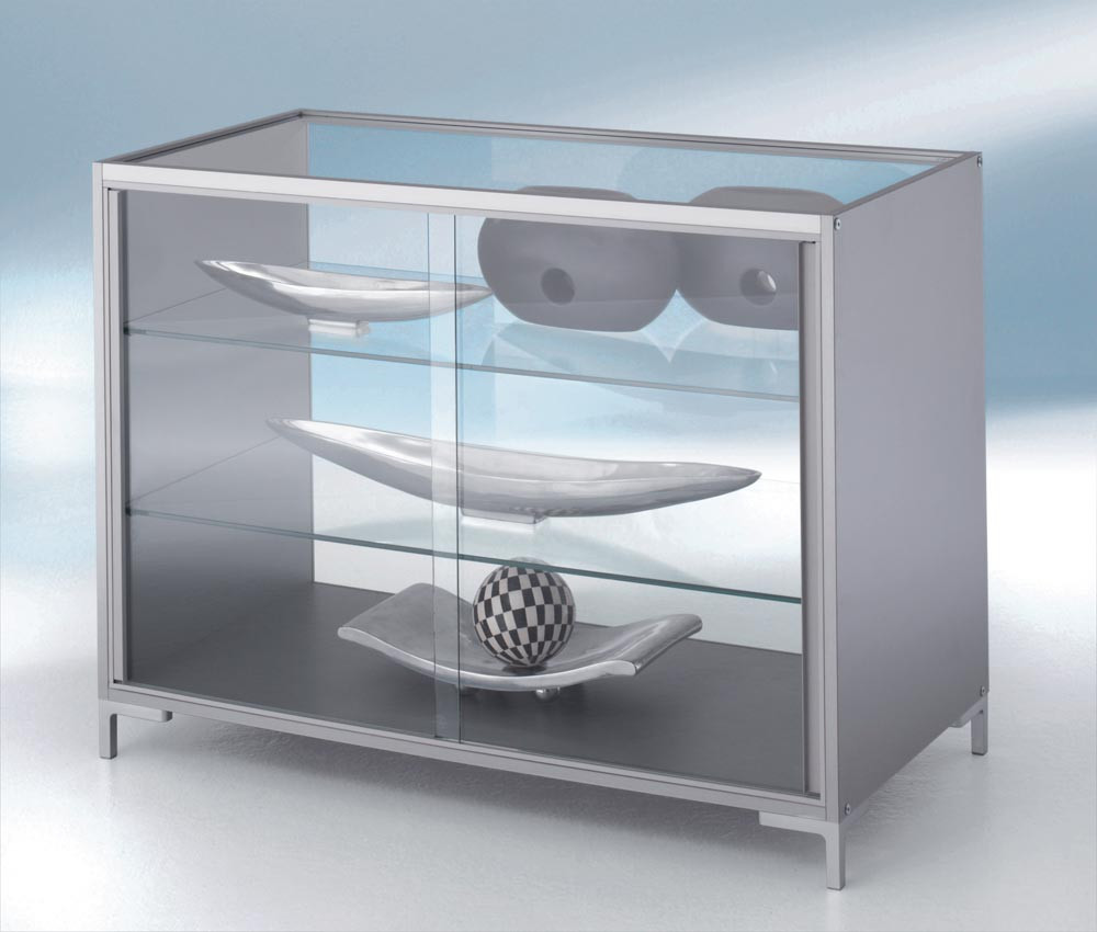 ∙ Vitrinen mit vertikalen Aluminiumprofilen 25 x 25 mm silber eloxiert ∙ Horizontaler Abschluss mit Dekorplatten in silber-metallic allseitig genutet für allseitige Glaseinfassung ∙ Türen in allseitiger Führung · Verglasung aus Einscheibensicherheitsglas ∙ Sicherheitszylinderschloss ∙ Stufenlos, höhenverstellbare Dickglasböden ∙ Designfüße in silber-metallic Höhe 90 mm · Beleuchtung gegen Aufpreis als Zubehör lieferbar