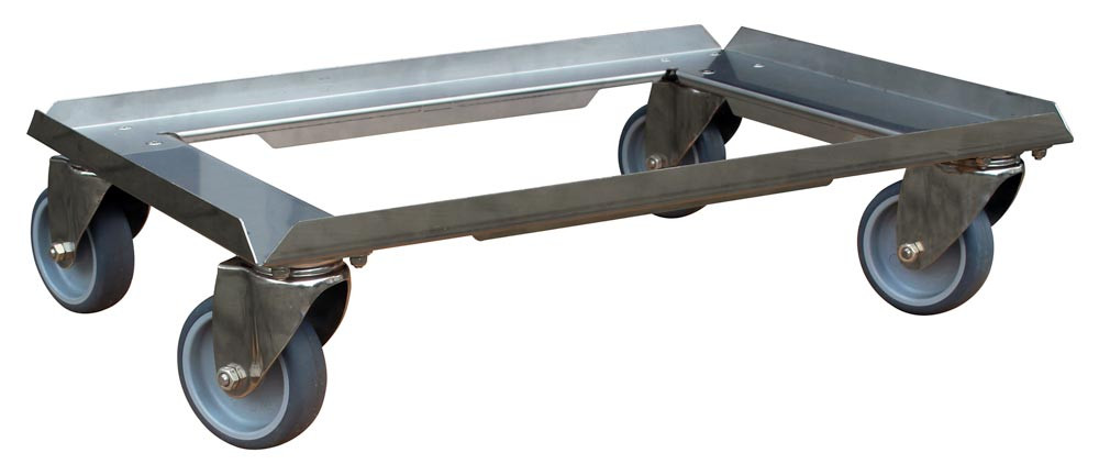 Transportroller zu eckigem Behälter LxB 600x400 mm, Edelstahlrahmen, 4 Edelstahl/Thermoplast Lenkrollen, Traglast 250 kg
