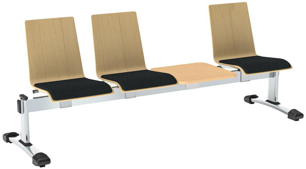 ∙ Mit 2,3 oder 4 Sitzelementen ∙ Integrierter Ablagetisch ∙ Tischplatte in Buchedekor mit ABS-Umleimer ∙ Sitzschalen aus 4-lagigem Buchenschichtholz, Stärke 4,5 mm ∙ Sitzpolster: Stärke 10 mm