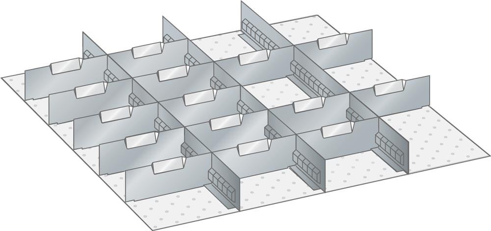 Trennwände, Fronthöhe 100 mm 3 Schlitzwände 36E, 15 Trennbleche 9E, Schubladennutzgröße BxT 612x612 mm