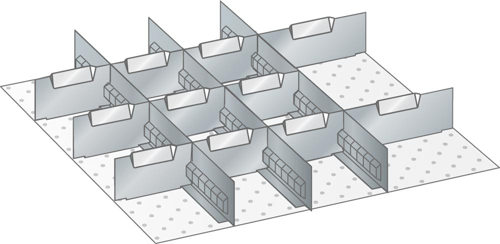 Trennwände, Fronthöhe 150 mm 3 Schlitzwände 27E, Trennbleche 9x6E u 2x9E, Schubladennutzgröße BxT 459x459 mm E876144