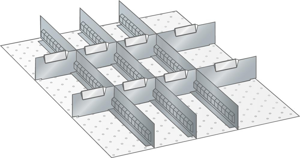 Trennwände, Fronthöhe 75 mm, 3 Schlitzwände 36E, 6 Trennbleche 6E, 2 Trennbleche 9E, Schubladennutzgröße BxT 459x612 mm