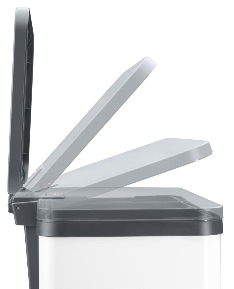 Tret-Abfallsammler, Volumen 3x9 l, BxTxH 470x340x430 mm, Gehäuse Stahlblech weiß, Kunststoff-Deckel schwarz mit Soft-Close E6042098