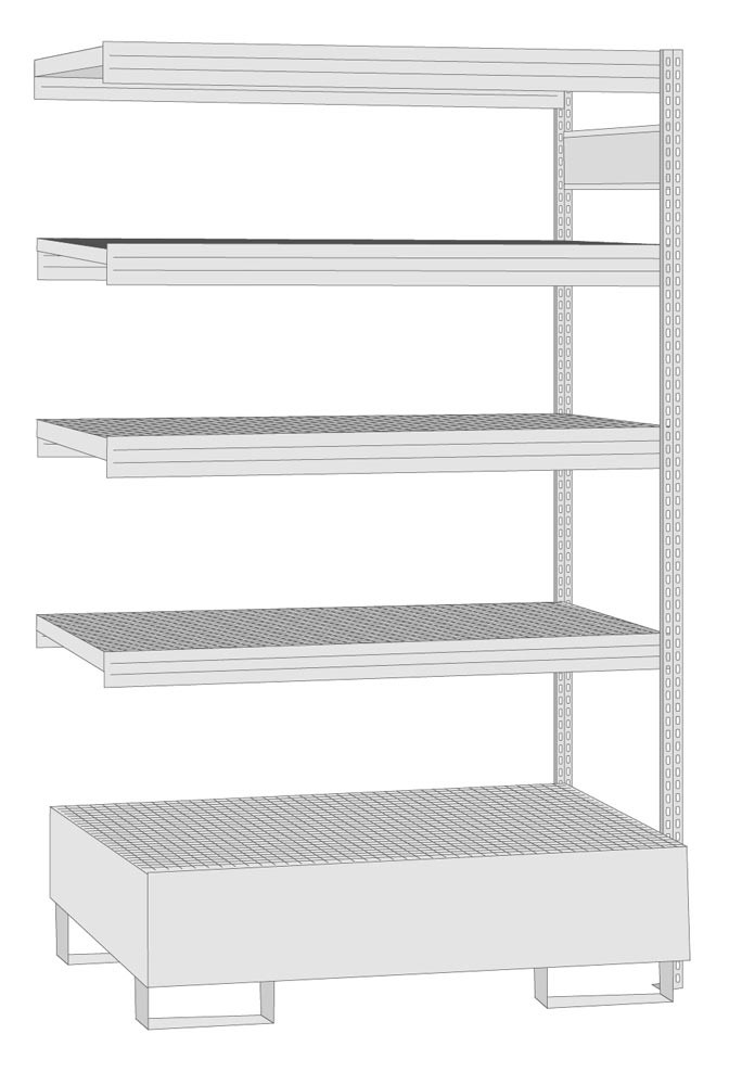 Umweltregal, Anbaufeld, offener Rahmen, mit 4 Gitterrost-Fachebenen und Auffangwanne Auffangvolumen 210 l, BxTxH 1285x600x2500 mm E812706