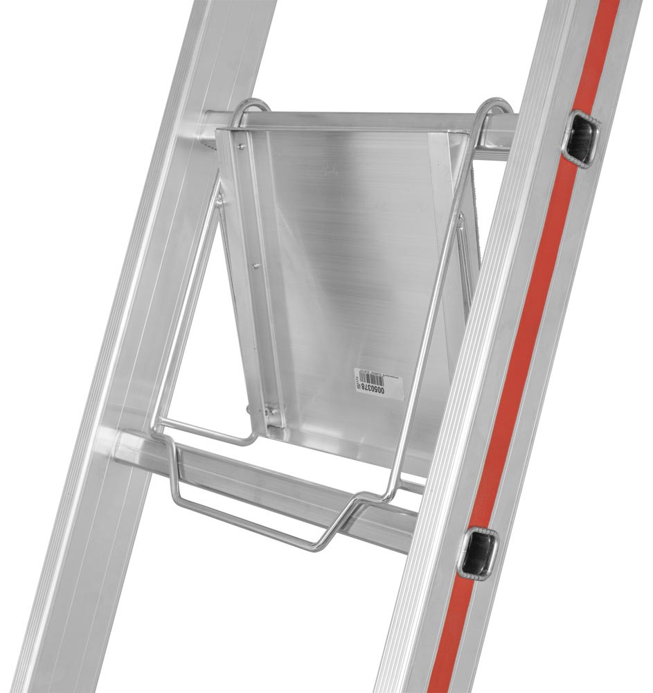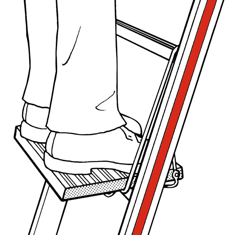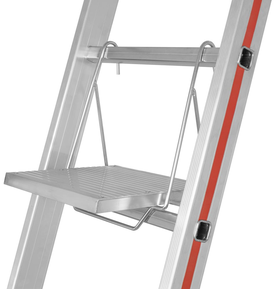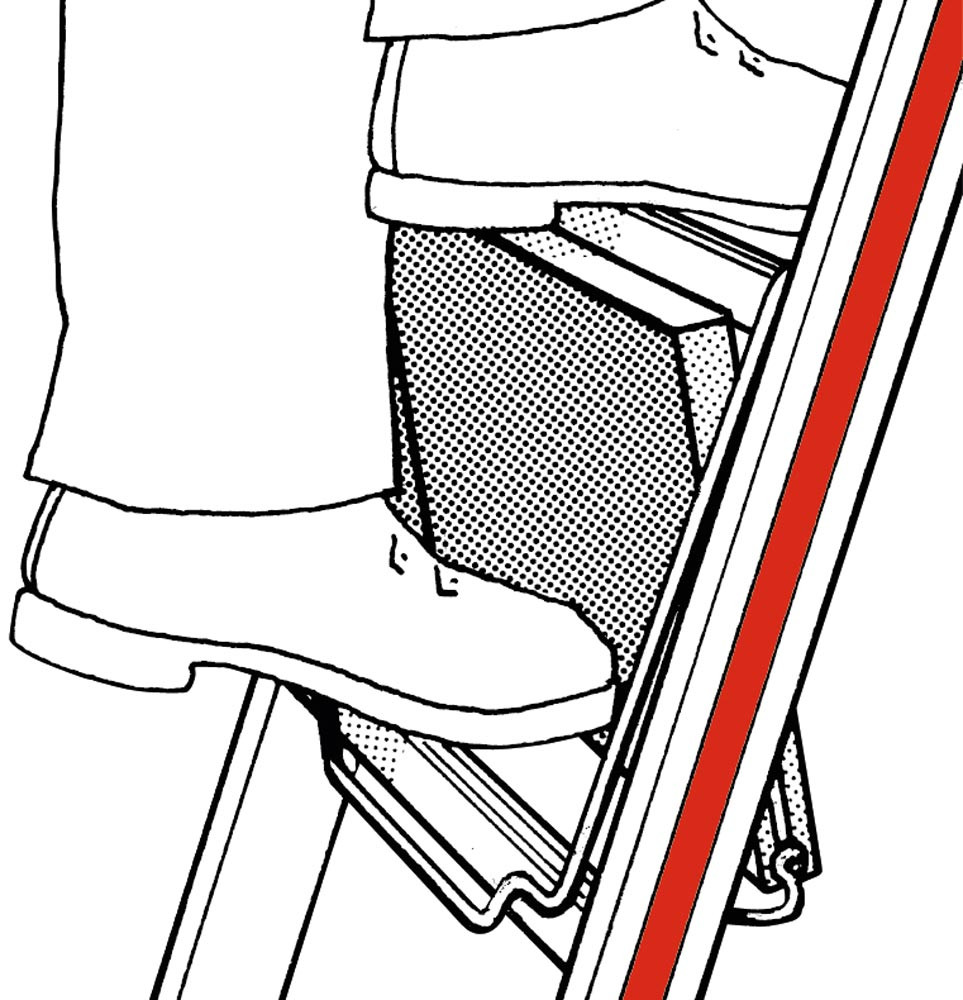 ∙ Sicherer Standplatz auf der Leiter durch mittig über der Sprosse angeordnete Trittfläche ∙ Durch den hochklappbaren Tritt ist ein sicheres Besteigen der Leiter gewährleistet