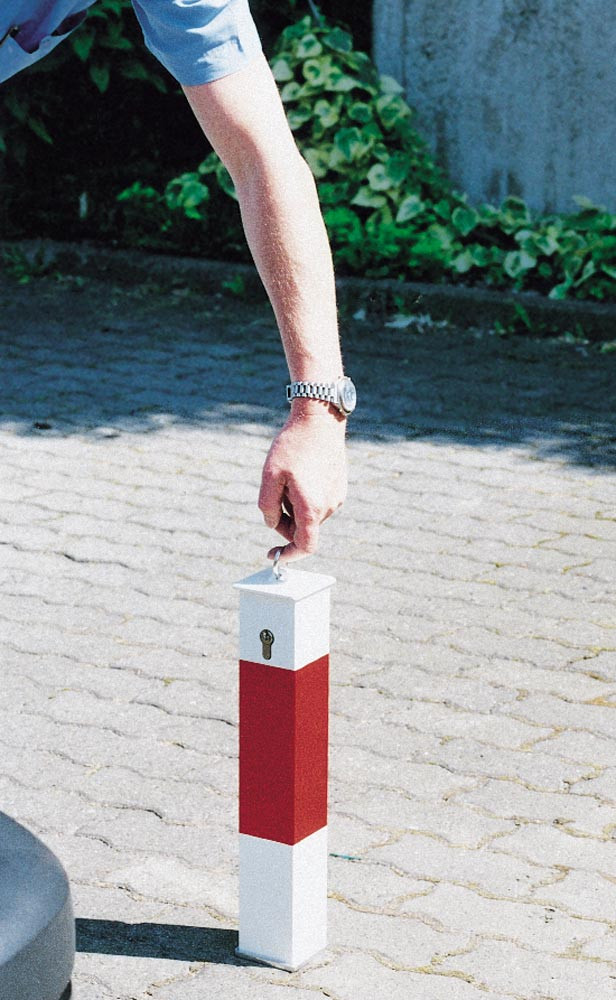 Versenkbar Sperrpfosten aus Alu, quadr. 70x70 mm, mit Profil-Zylinderschloß, weiß mit roten Leuchtst reifen