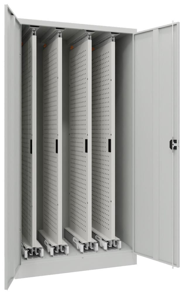 Vertikalauszugschrank, 4 Auszüge mit Lochplatten, BxTxH 1000x600x1950 mm, RAL 7035
