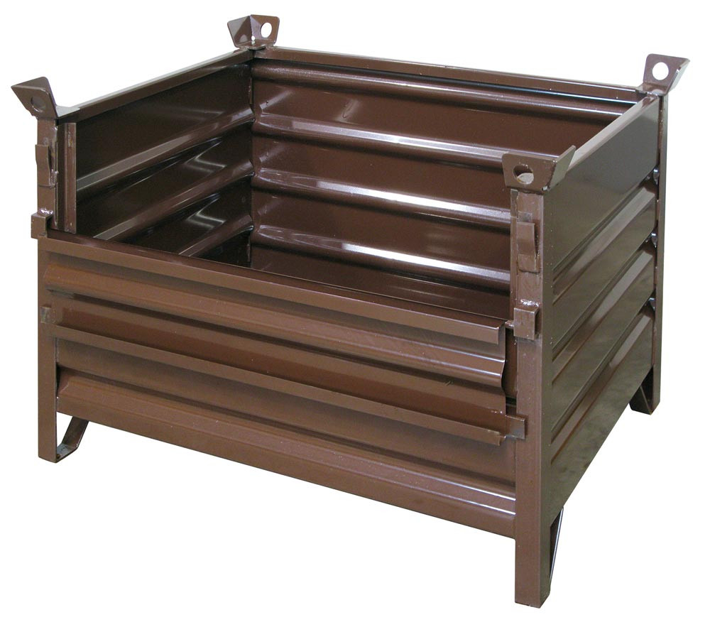 · Aus profilierten Eckpfosten, mit 2 mm starkem rippenverstärktem Trapezblechboden und rippenverstärkten Seitenwänden · Mit angepreßten Stapeltaschen und Kranösen · Traglast 1500 kg · Auflast 3000 kg · 3-fach stapelbar bei voller Last · Unterfahrhöhe 100 mm