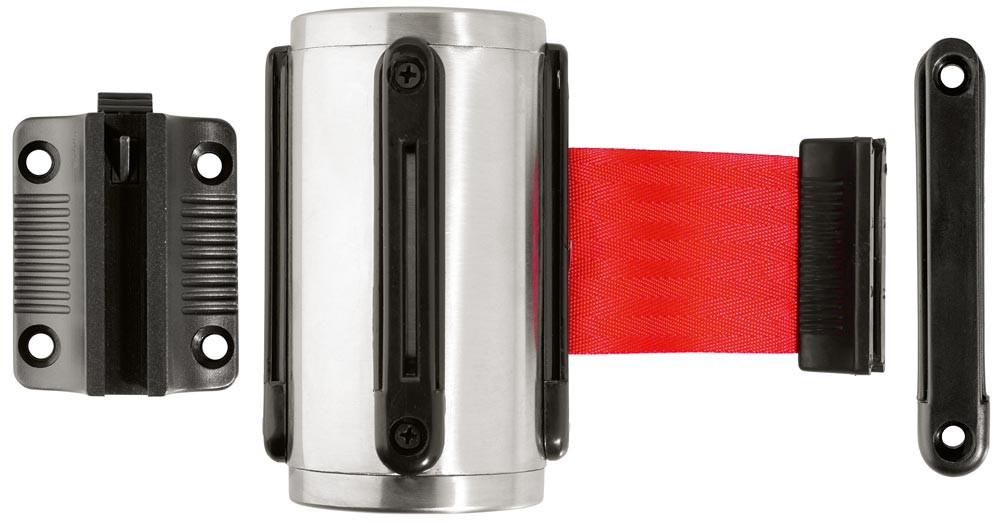 Wand-Gurtkassette, Edelstahl geb. mit rotem Gurt, Gurtlänge max. 3 m