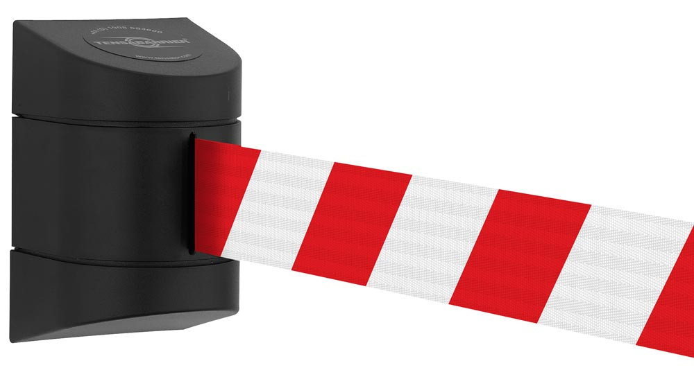 ∙ Nur für den Innenbereich geeignet ∙ Zum permanenten Einsatz in Treppenhäusern, Durchgängen oder in Maschinenhallen ∙ Wandfixierung und Wandhalterung im Lieferumfang enthalten ∙ Gehäuse aus schwarzem Kunststoff mit farbigen Kappen ∙ Gurtlänge 4600 mm