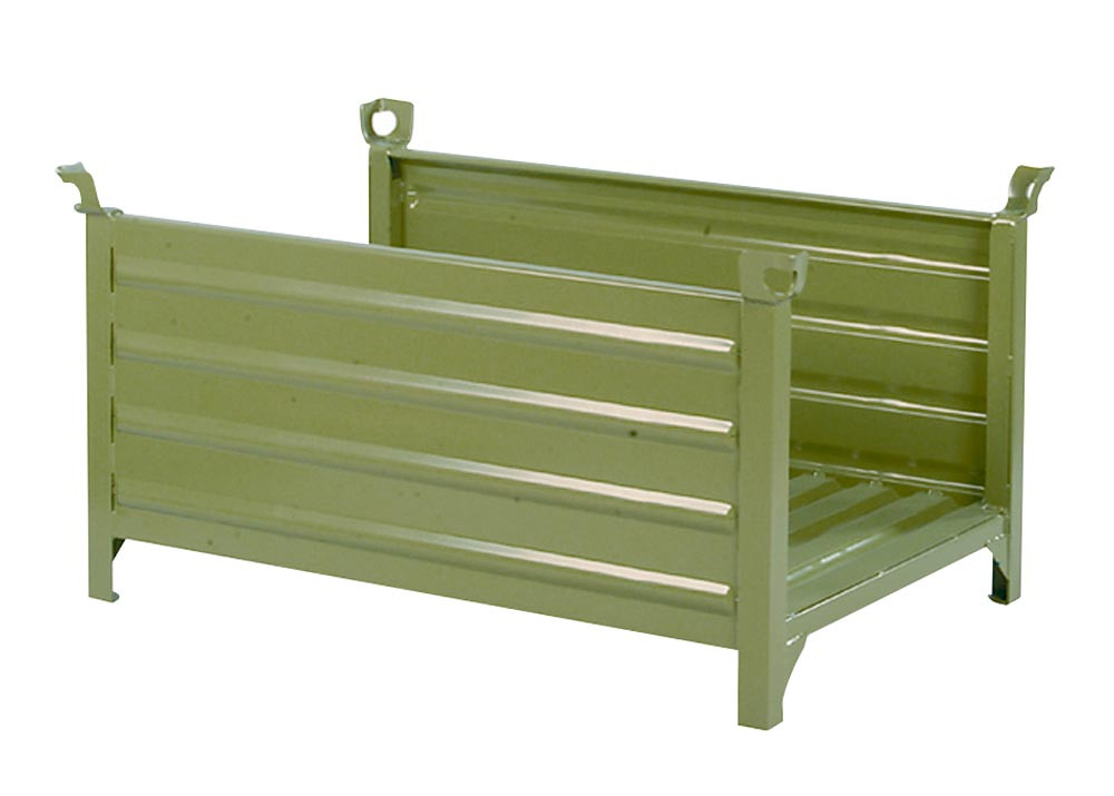 ∙ Robuste Stahlblechkonstruktion · Seitenwände werden durch Rundsicken versteift · Vier angeschweißte Fangecken (6 mm stark) zum Stapeln ∙ Boden 2 mm stark mit Rundsicken versteift ∙ Füße durch Knotenbleche gestützt ∙ Unterfahrhöhe 100 mm