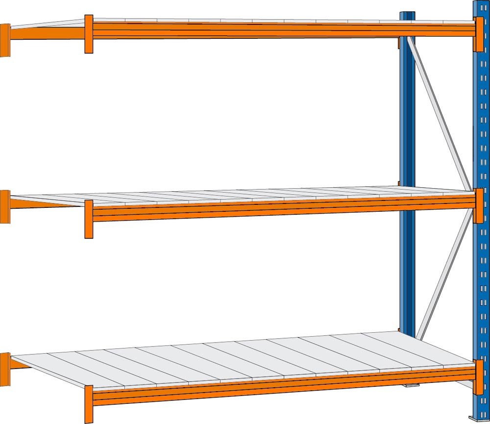 Weitspannregal, Anbaufeld, 3 Ebenen mit Stahlpaneele, BxTxH 1850x600x2000mm, Fachlast 777 kg, Z-Profil 74x30x1,5mm
