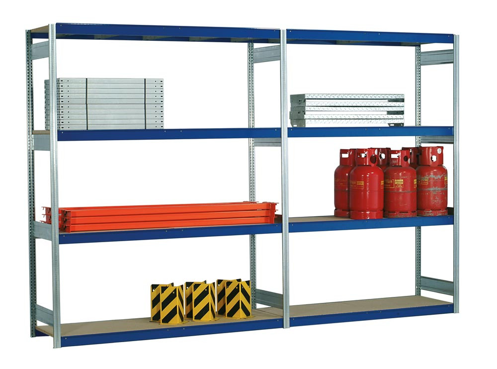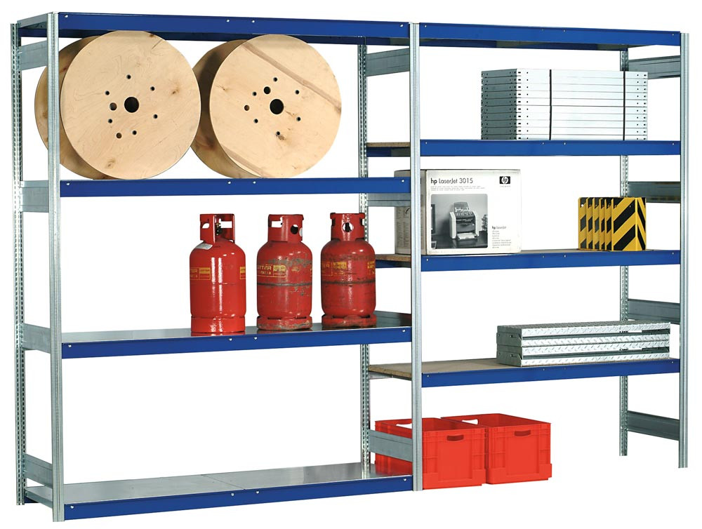 Weitspannregal, Grundfeld, 4 Lagerebenen mit Spanplattenboden, BxTxH 2010x500x2000 mm, Rahmen verzinkt, Traversen blau, Fachlast 400 kg