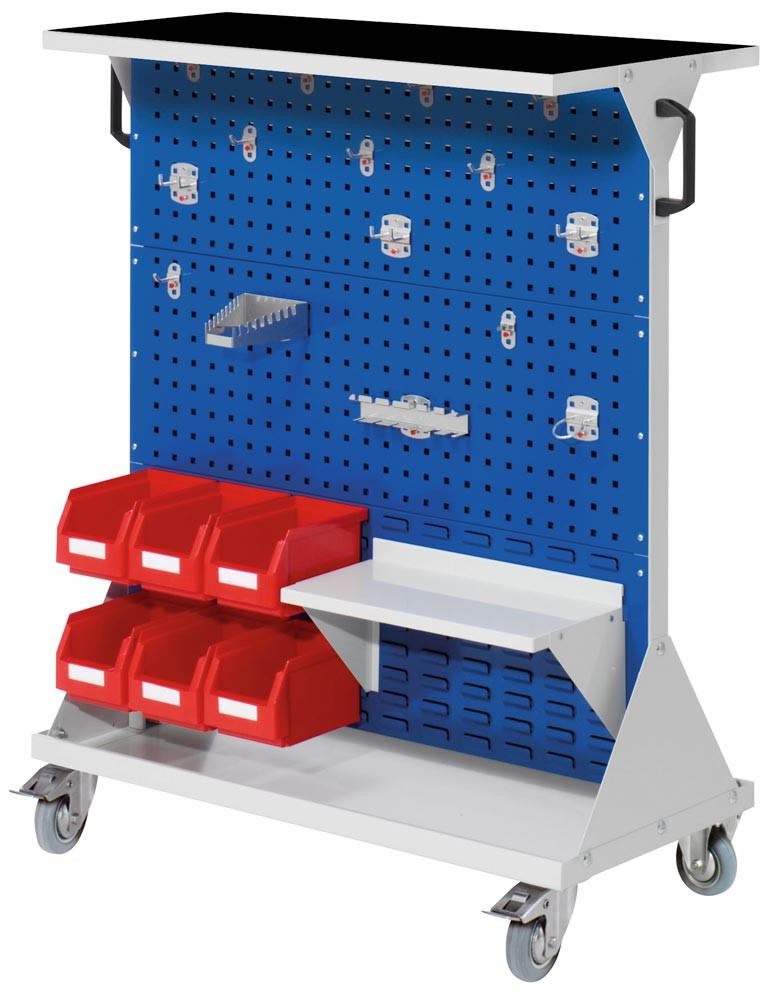 Werkstattwagen, 4 Loch-/2 Schlitzpl., 1 Hakensor. 15-tlg., 6 Kästen, BxTxH 1000x500x1270 mm, 1 Auflage boden Stahl mit Riffelgummi, RAL 7035/5010