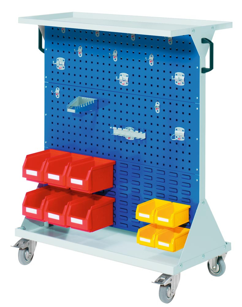 Werkstattwagen, 4 Loch-/2 Schlitzpl., 1 Hakensort. 15-tlg., 10 Kästen, BxTxH 1000x500x1270 mm, 1 Auflageboden Stahl, RAL 7035/5010 E1991208