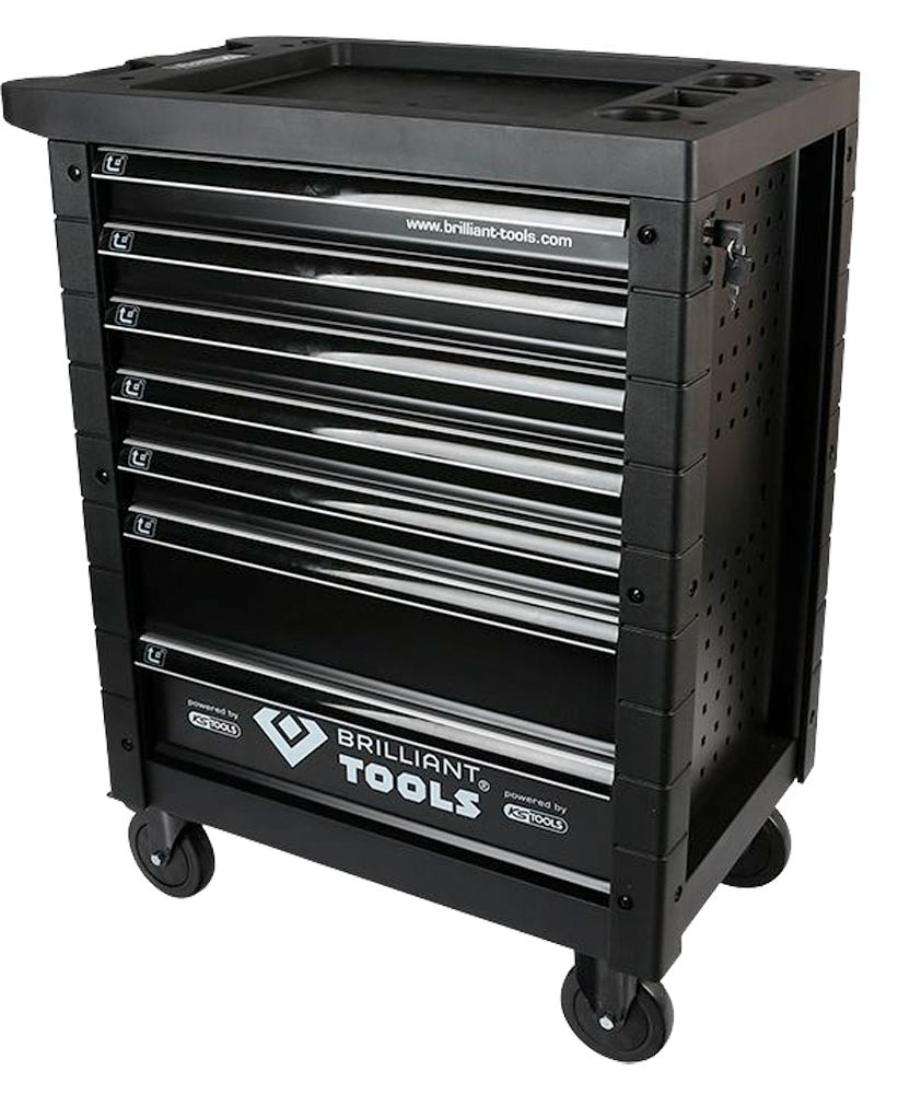 ∙ 7 Schubladen bestückt mit 207 bzw. 473 Werkzeugen ∙ Einzelverriegelung verhindert ungewolltes Öffnen ∙ Zentralverriegelung aller Schubladen durch Zylinderschloß ∙ Kantenschutz aus Kunststoff ∙ Rollen mit 2 Lenk- und 2 Bockrollen ∙ Belastbarkeit der Schubladen 35 kg, Gesamttragkraft 400 kg ∙ Gesamtmaße B x T x H 770 x 470 x 975 mm ∙ Kugelgelagerte Schubladen mit Vollauszug