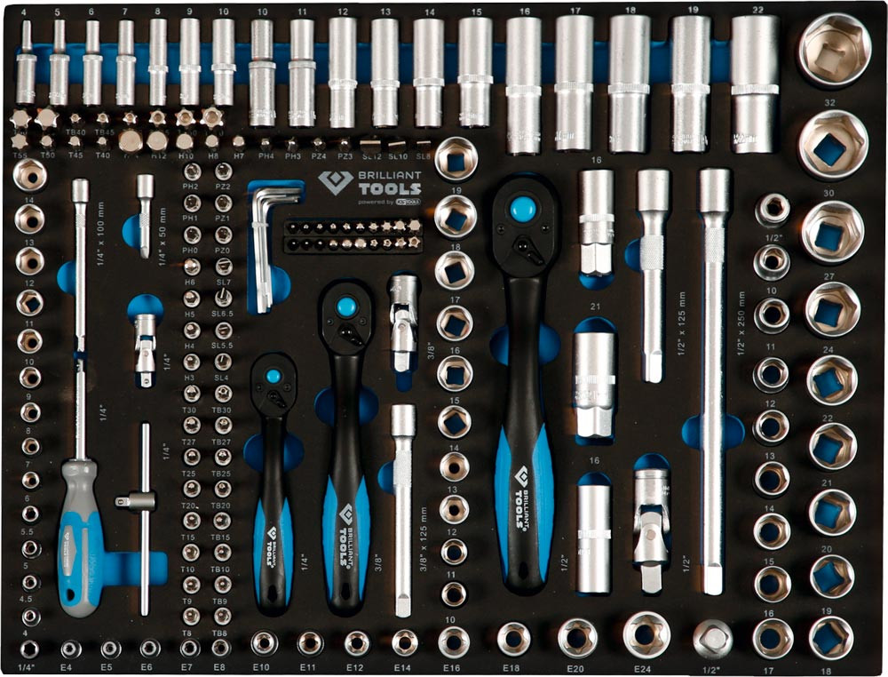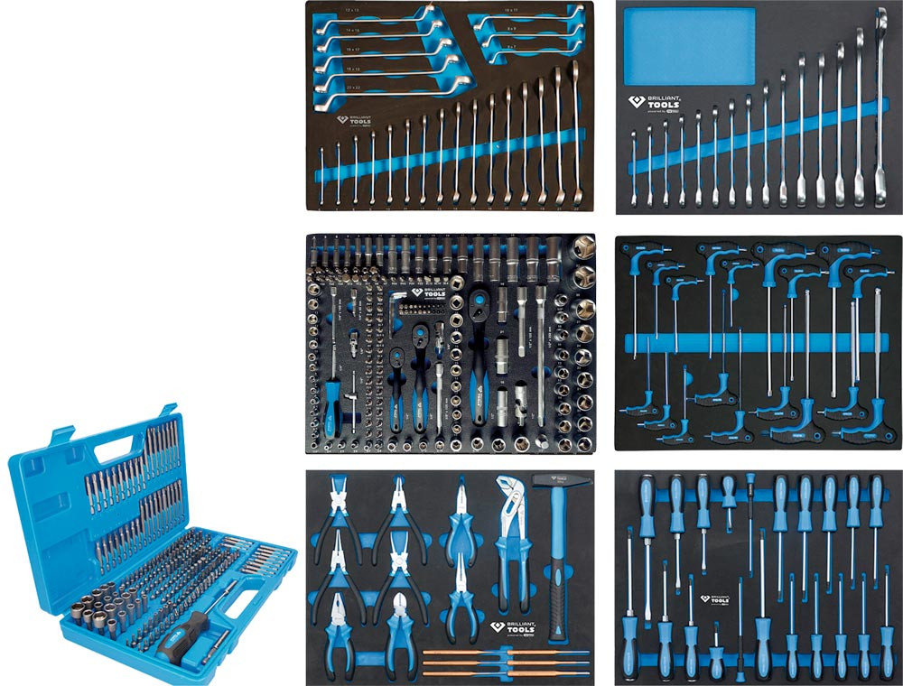 ∙ 7 Schubladen bestückt mit 207 bzw. 473 Werkzeugen ∙ Einzelverriegelung verhindert ungewolltes Öffnen ∙ Zentralverriegelung aller Schubladen durch Zylinderschloß ∙ Kantenschutz aus Kunststoff ∙ Rollen mit 2 Lenk- und 2 Bockrollen ∙ Belastbarkeit der Schubladen 35 kg, Gesamttragkraft 400 kg ∙ Gesamtmaße B x T x H 770 x 470 x 975 mm ∙ Kugelgelagerte Schubladen mit Vollauszug