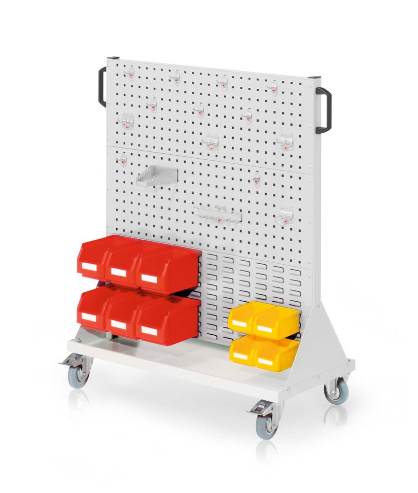 Diese mobilen Helfer für Werkstatt und Montagehalle sind beidseitig mit Lochplatten und/oder Schlitzplatten zur Aufnahme von Werkzeug- und Kleinteilehaltern, sowie Sichtlagerkästen bestückbar. Die Werkstattwagen verfügen beidseitig über einen ergonomischen Handgriff.
