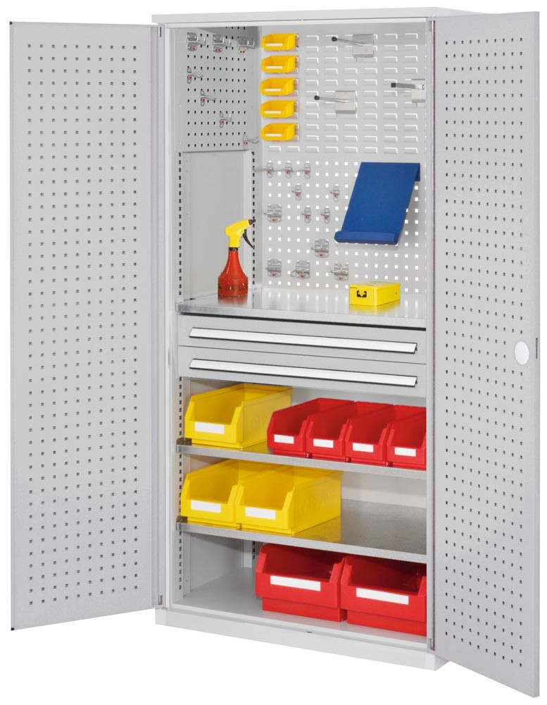 Werkzeugschrank, Türen mit Lochplatten, 2 Schubl.+ 3 Fachb., BxTxH 1000x600x1950 mm, RAL 7035
