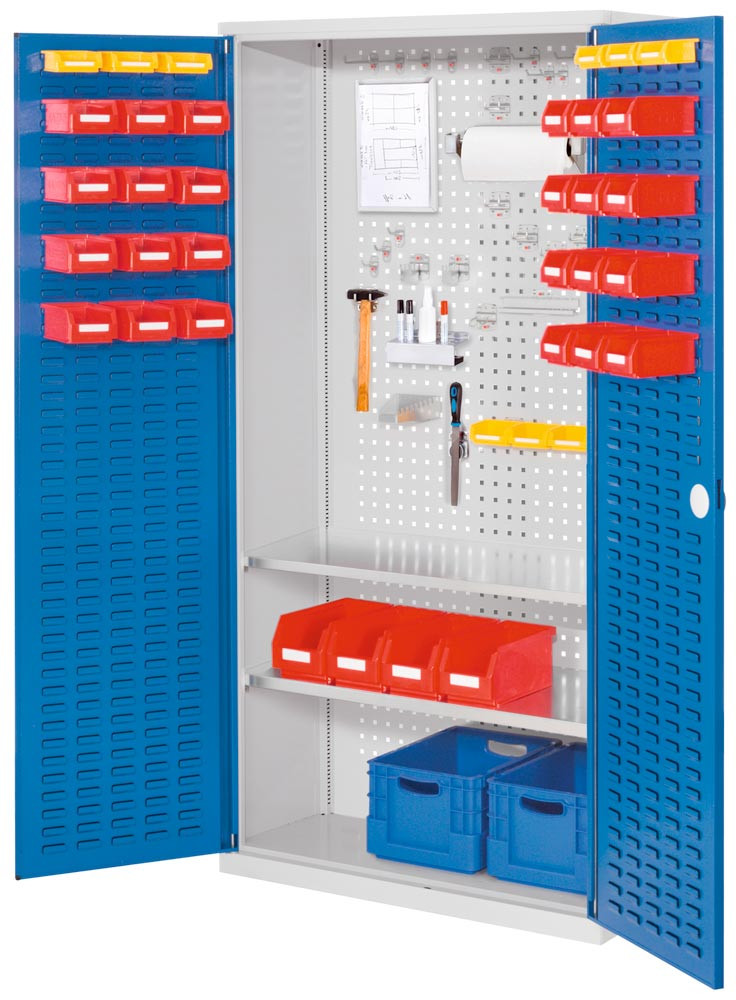 ∙ Hochwertiges Werkzeug, empfindliche Arbeitsgeräte und diverse Kleinteile sicher und übersichtlich untergebracht ∙ Korpus aus geschweißtem Stahlblech ∙ Mit Lochraster in der Rückwand ∙ Aufschlagende, doppelwandige Flügeltüren, Öffnungswinkel > 200° ∙ Dreiriegeliges Sicherheits-Zylinderschloß mit versenktem