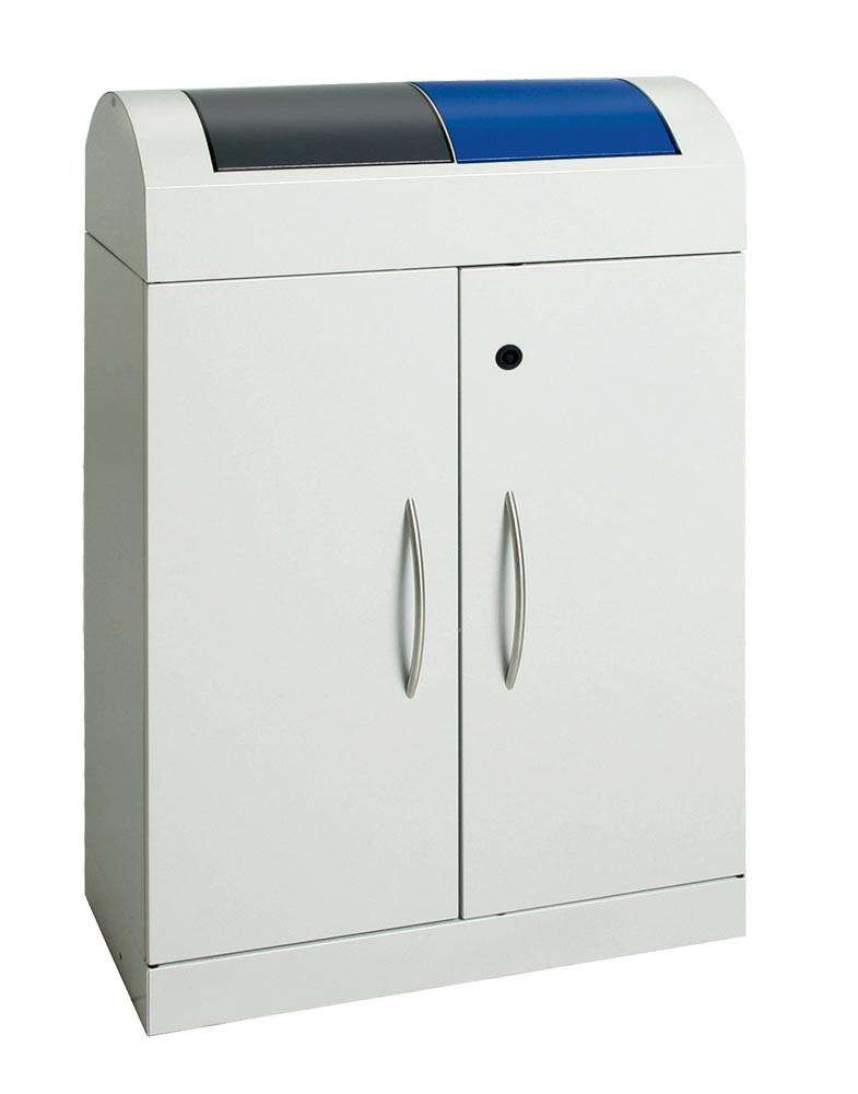Werstoffsammelstation, Volumen 2x45 Liter, BxTxH 620x320x975 mm, Korpus RAL 7035 lichtgrau, Schwingdeckel blau + anthrazit