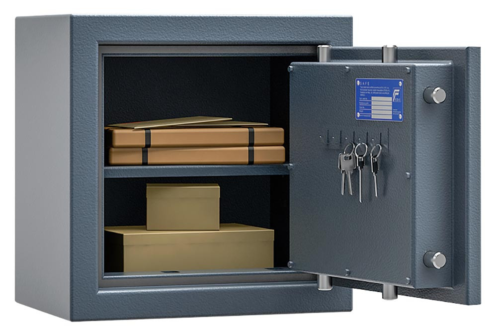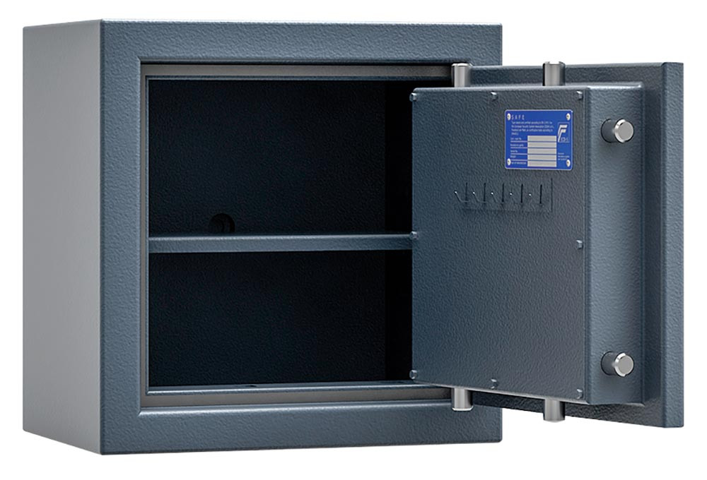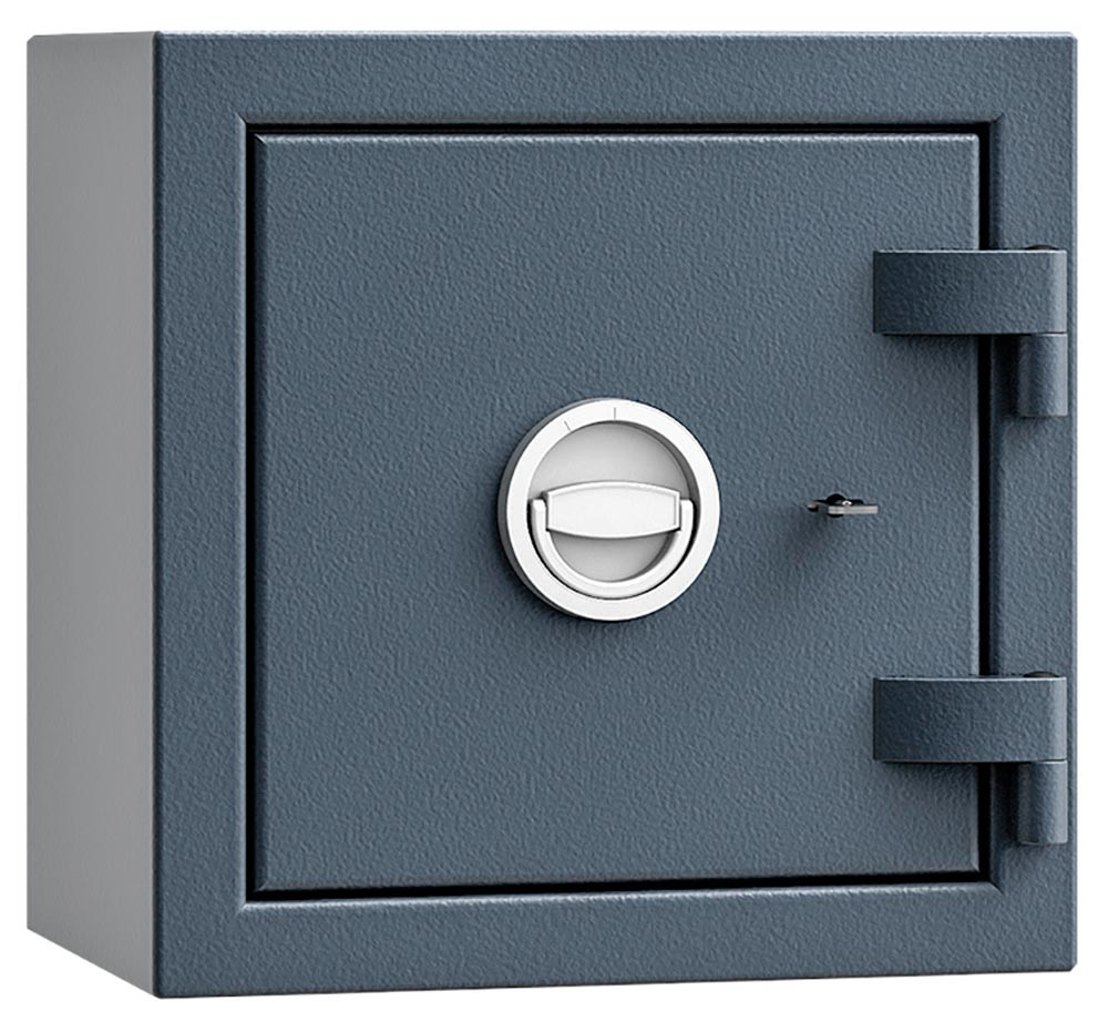 ∙ Leichte Ausführung mit Widerstandsgrad I nach EN 1143-1, ECB*S zertifiziert ∙ Hoher Einbruchschutz durch allseitig mehrwandigen Korpus und mehrwandige Tür, 80 mm stark ∙ Verankerung durch eine Bohrung am Boden vorbereitet ∙ Verriegelung erfolgt über ein Doppelbart-Hochsicherheitsschloss VDS-Klasse I mit 2 Schlüsseln ∙ Beschläge und Scharniere 50 mm vorstehend ∙ Hochwertige Feuerschutzisolierung ∙ Inkl. Verankerungsmaterial ∙ Lackierung RAL 7035 lichtgrau oder RAL 7024 graphitgrau