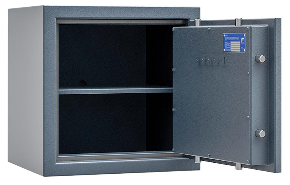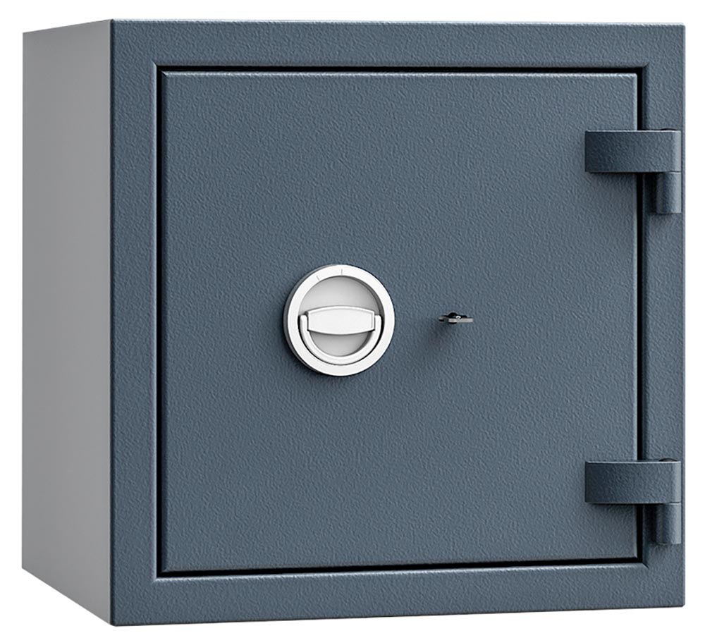 ∙ Leichte Ausführung mit Widerstandsgrad I nach EN 1143-1, ECB*S zertifiziert ∙ Hoher Einbruchschutz durch allseitig mehrwandigen Korpus und mehrwandige Tür, 80 mm stark ∙ Verankerung durch eine Bohrung am Boden vorbereitet ∙ Verriegelung erfolgt über ein Doppelbart-Hochsicherheitsschloss VDS-Klasse I mit 2 Schlüsseln ∙ Beschläge und Scharniere 50 mm vorstehend ∙ Hochwertige Feuerschutzisolierung ∙ Inkl. Verankerungsmaterial ∙ Lackierung RAL 7035 lichtgrau oder RAL 7024 graphitgrau