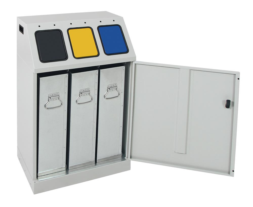 Wertstoffsammler, Volumen 3x30 Liter, BxTxH 580x380x920 mm, Korpus RAL 7035 lichtgrau, Schwingdeckel blau, anthrazit + gelb, verzinkte Innenbehälter E1967229