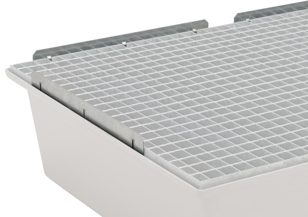 Zubehör zur Fassregalen mit 220-l-GFK-Auffangwanne: Randleisten (4-teilig), verzinkt, zum seitlichen Einstecken in das Stahlgitterrost